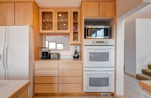 Our kitchen is full-sized and has everything needed for all meals, including a double oven. There is also a breakfast bar, as well as a dining area, which flows into the living room. Seating for 20 is provided (8 at the kitchen table, 6 bar stools, and folding chairs and table for 6).