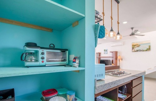 This 2-level condo consists of 1,600 sq ft per floor! This penthouse condo is paradise, off the beaten path just a 3-minute walk to the beach, a short drive from Merida, and about a 12-minute drive to central Progresso. You'll find it hard to leave this tranquil place called Miramar Beach Condos! The communal pool is spectacular, with lounge chairs to sunbathe and a bar to set a cooler of drinks, plus we’ve provided beach chairs. The condo is outfitted with the most important comforts of home, and there’s an added bonus - your own private rooftop terrace with a shaded seating area decorated with a wall mural. Having a private plunge pool to cool off and a bar to make refreshing beverages will become your favorite place! The condo features 10 ft ceilings, quality furnishings, linens, and appliances, while the splashes of aqua-painted walls, beautiful paintings of beaches, and themed décor promote a soothing beachy vibe.