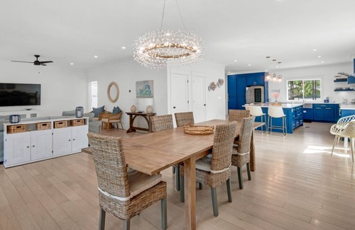The main floor of this home is wide open and perfect for entertaining family and friends on vacation. The beautiful blue custom kitchen features a large island where everyone is sure to gather. Off the kitchen and overlooking the pool is a separate dining area as well. You can also grab some fresh air on the balcony at the front of the home. Or relax in front of the TV after a day of splashing around at the private saltwater pool.