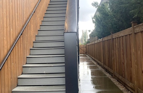 Guest Suite is very private, located above a garage with your own separate entrance. Outdoor sitting area is a shared common space with another Airbnb on site.