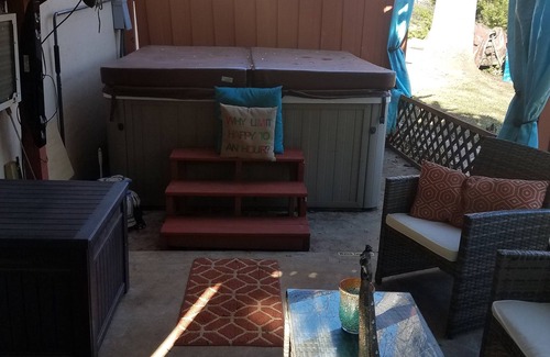 Private Suite with separate rear entrance. Suite accommodates a couple & includes everything you need (hot tub with tv on patio, fireplace, firepit with wood provided, electric pellet grill, mini-fridge, toaster oven, microwave, WIFI, Smart TV in sitting area with bluetooth surround, and hammock) for a romantic & relaxing getaway!