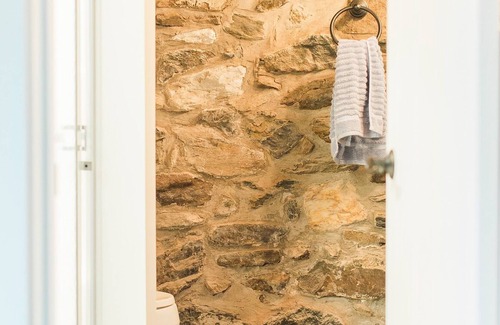 Our home is a renovated Lancaster County Farm House. The guest suite is a totally new part of the house, while the bathroom has original beams and a stone wall.