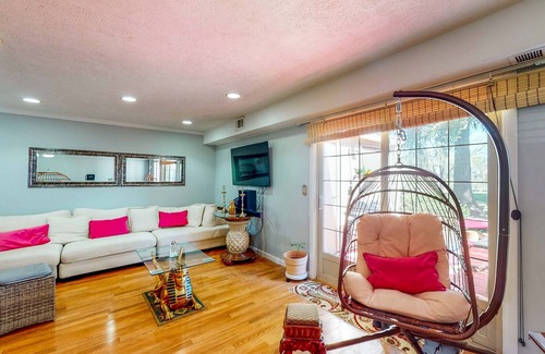 Inside the eclectic and fun interior of your stay, discover a spacious living room complete with ample soft seating and a large TV. From this space, effortlessly walk over to the designated workspace and formal dining room table.
