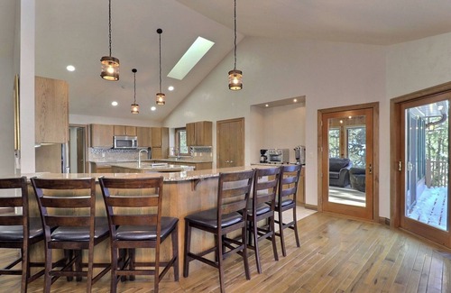 Kitchen has double oven, gas range and full size fridge. The kitchen is fully stocked and has seating for 6 at the granite counter top and room for 8 more at the table over looking the lake.