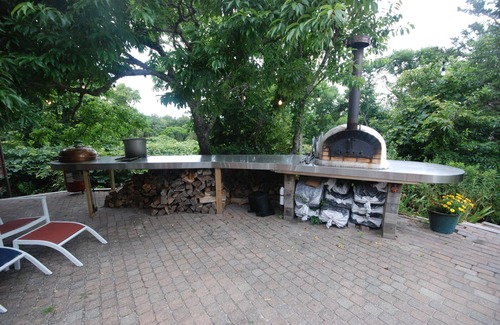 Deck with a table for ocean view dining, outdoor shower, a cooking patio with a wood-fired pizza oven, BBQ and small vegetable garden.