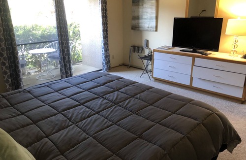 Spacious ground level unit 2BR/2BA, updated and tastefully decorated. Sleeps six: king bed in a master suite with private bathroom and separate entrance; two queen beds in a second bedroom off the main entry. Bathrooms are well lit and newly remodeled with quartz counter tops and tile.