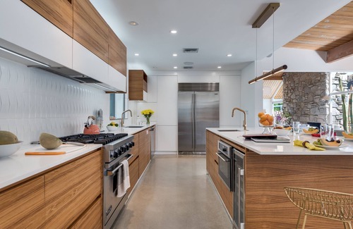 This private refuge has soaring ceilings, a gourmet kitchen, sumptuous retreats and a private backyard which feels like your own private resort. The attention to detail surrounds your senses as it embraces everything about mid-century architecture: tongue and groove ceilings, fireplaces and fire pits, teak wood details, breezeblock and brise soleil, outdoor boomerang bar with modern and updated comforts: meticulously designed baths, large saltwater pool with two tanning decks, outdoor natural stone ping-pong table, poolside sun and cabana-style lounging.