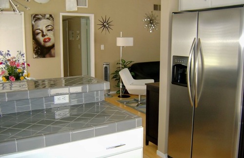The interior boasts chic retro-modern decor, high ceilings in the living room and kitchen, and light wood floors throughout. Furnished with modern appliances and conveniences, this home is perfectly designed for a memorable Palm Springs getaway. Located in a quiet, friendly neighborhood near Demuth Park, you’ll also be just moments away from the shopping, dining, and recreation that make Palm Springs famous.
