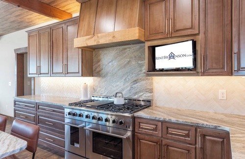 Inside, you'll be in awe at the open-concept living area with 26-foot vaulted ceilings, a floor-to-ceiling stone gas fireplace, and a wall of windows that flood the space with natural light while framing breathtaking lake views. The fully-equipped kitchen is a chef's dream with a 48" gas range with griddle, double ovens, a 10-foot island, and a Smart TV. Gather around the dining table where meals become cherished moments, while the sun glistens on the lake just beyond. Step out onto the main level deck to discover your private oasis. Jump into the seasonal outdoor pool, soak in the private hot tub, or relax with the game on the 75" Smart TV all with Table Rock Lake as the back drop.