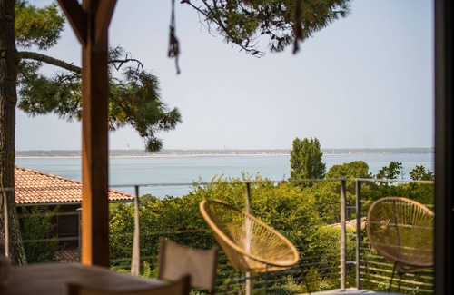 Unique charm for this magnificent villa in a quiet and residential area of Pyla. Organized over two levels, the Baïa villa offers, from its spacious wooden terrace, a superb unobstructed view of the trees and the Basin. Its refined decoration, delicately blending soft tones and natural materials, gives a resolutely holiday feel to this exceptional property.