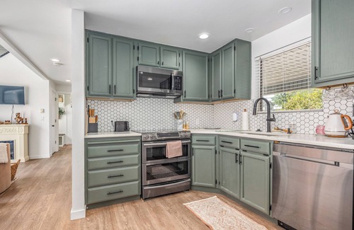 Inside, you’ll find a spacious and inviting living area featuring a large flat-screen TV and a cozy fireplace, perfect for unwinding after a day of exploring the city. The private fenced yard offers a peaceful outdoor space where you can relax, enjoy your morning coffee, or simply soak in the serene surroundings.