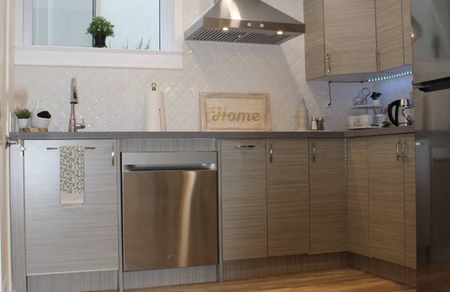Modern lower-level suite with queen bed, kitchen, living area, and 3-piece bathroom. Includes in-suite washer/dryer.