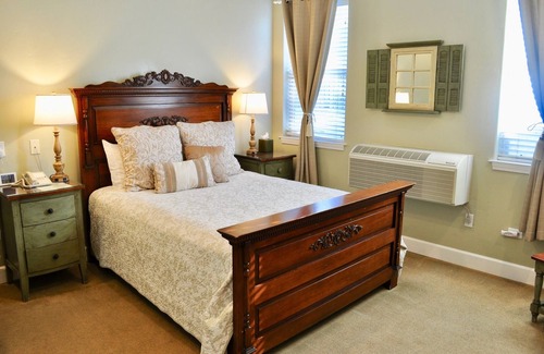 This single level 500sqft suite has a custom made Queen size bed decorated in blues and greens. Enjoy the fireplace, Jacuzzi tub/shower combo. Accompanied by reverse osmosis drinking water spout and a bar sink. Along with a mini fridge. ADA accessible. For the hearing impaired we have a doorbell on the room along with an interior light above the inside of the door, to alert the guest. Their are grab bars in the tub and near the toilet. ***Comes with a daily served gourmet breakfast and nightly fresh baked cookies
