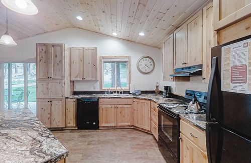 This one-level cabin is located at the end of a dead-end road and is nestled in the pines. A large three-bedroom, two-bath home, this place is perfect for larger families and groups of friends. The home has been beautifully remodeled with lots of wood accents, a comfy cabin in the woods with all the in-suite amenities you need for a comfortable and relaxing vacation. The entry is on the back end of the home and opens up to a large open floor plan that encompasses the living and dining areas and the kitchen - even the group chef can join in on the conversation! Large living room windows look out onto the smaller wrap-around deck.