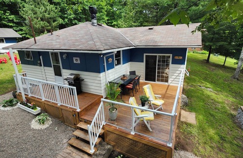 Tequila Sunrise is a charming classic cottage on beautiful Pickerel Lake that is 30 min north of Huntsville. This spacious tree-lotted backyard has stunning views of the lake. We provide 2 kayaks, 1 paddle board, 1 peddle boat, and a few floaties, or bring up your own water toys and enjoy time on the lake with easy access to the water from our 50ft dock. Please bring water shoes as the bottom of the lake is a mix of rock and sand. You are more than welcome to use our dock for your own boat, and there is a public boat launch on Pickerel Lake just a few minutes away. Shallow entry from lakeshore will ensure a wonderful vacation for families with small children or pets. There is also a public beach on Pickerel Lake that has a shallow entrance into the water, which would be great for a fun afternoon with the kids. From the cottage, you can step onto a new wrap around deck, which also has great views of the lake. Tequila sunrise can sleep up to 8 people as it has 1 queen bed, 1 double, and 2 twin beds. The main living room has a sleeper sofa for extra sleeping space. This cottage has newly installed vinyl plank flooring throughout the whole cottage to make it pet friendly! There are indoor and outdoor games provided to make fun memories that will last forever!
