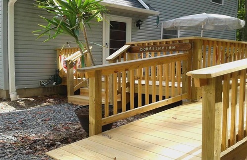 Contact me about rates and specials. This vacation rental is about 5 years old and HANDICAPPED FRIENDLY – featuring wide pocket doors, taller commodes, shower stall on first floor, open floor plan and access ramp to spacious deck and front door. Two bedrooms on first floor, 1) twin over full bunk bed, 2) queen sized bed. Eating area, kitchen, great room and gas fireplace round out the first floor. Cathedral ceiling, upstairs loft with futon, a larger bedroom with queen sized bed and private coffee deck. Second bathroom also features taller commode with bathtub/shower. Wi-Fi, flat screen TVs, K-cup coffee.
