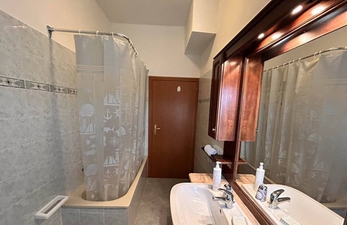 Two bedrooms apartment of 70 sqm on the first floor, with sitting area in the garden /gazebos. Double bedroom with en suite bathroom with shower, triple bedroom, Living room with kitchen corner (fridge with freezer, microwave, coffe machine, filter coffee machine, toaster, kettle) and double sofa bed, one bathroom with tub and shower head.