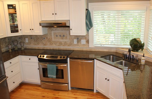 When it’s time for dinner, whip up a delicious meal in the fully equipped kitchen, which has been fully updated with custom cabinetry, granite counter tops and stainless steel appliances. Casual additional seating is available in a small breakfast nook or on stools at the kitchen island.