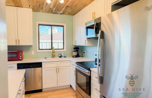 A fully equipped kitchen is provided including a full size Fridge/Freezer/Ice Maker, an Oven, a Toaster oven and even a Kitchen Aid Mixer should you feel inspired to whip up something extra special during your vacation.