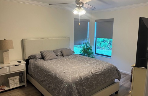 Enjoy a peaceful stay in a garage access room in our Country Club home in Sarasota. The bedroom features a comfortable Queen bed, perfect for a good night's sleep. With amenities like a washing machine, Wi-Fi, AC, pool , TV and access to kitchen, den, and coffee bar. Guests will have everything they need for a phenomenal stay. We think our place will help you experience everything Sarasota has to offer.