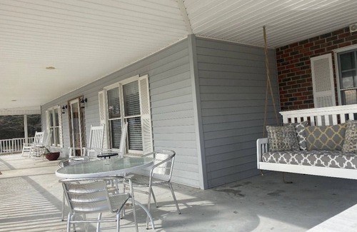 Beautiful home on a 10-acre fenced lot. Spacious front porch with two bench swings, plenty of seating and tables for an outdoor breakfast.