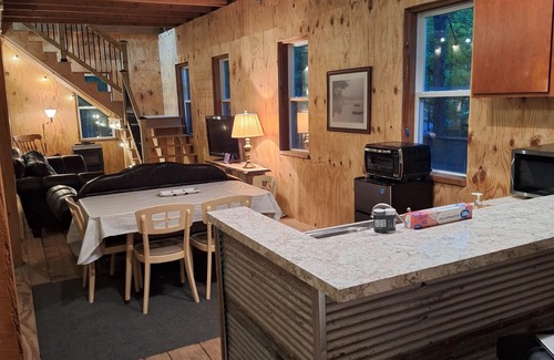 Located near Fredonia, enjoy what this 3-bedroom cabin has to offer. Step inside this enchanting retreat featuring 1 queen bed, 1 bunk bed, and 2 twin beds. The cozy interior is perfect for guests looking for a soothing escape- a rustic cabin in the woods for your relaxation and refreshment! On the main level, there is: a kitchenette with a microwave, toaster oven, dorm-sized refrigerator, and (of course!) coffee maker; a queen-sized bed plus bunkbeds; and a full bathroom with laundry facilities. Upstairs, there are 2 basic bedrooms including twin-sized beds. High-speed internet is included. On-demand hot water in the brand new bathroom! Leather sofas and a TV with Roku in the living room provide a comfortable place for you and your guests to relax and enjoy thousands of movies and programs for free. Catch up on the novel you've been waiting to dig into in the the rocking chair with a view of the woods. Relax outside by the firepit. A gas grill and additional cooler are provided. The spring-fed lake is just a short walk away, so come with your paddleboard, canoe, or kayak. The fishing is great year-round! Only non-motorized boats are allowed. Towels, linens, dishes, utensils, soap, and shampoo are included! Freshly remodeled and available. No smoking and, regretfully, no pets allowed. We hope you'll enjoy your stay at our cabin.
