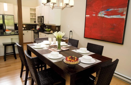 Lovely comfortable seating in the living room with cozy corner gas fireplace make evenings with family extra special. There is also an in-suite full size washer and dryer. WiFi is complimentary and there is a flat screen TV with DVD player for your down time.