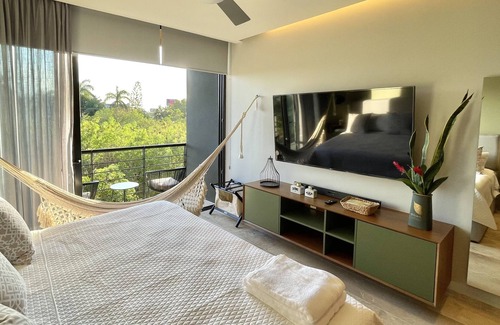 The bedroom is equipped with a king-size bed, air conditioning, a 60" Smart TV, a soundbar, a fan, a hammock, and everything necessary for a restful stay.