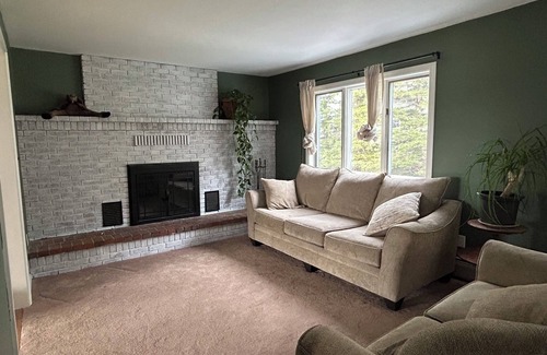 The house features a clean, functional layout with a full kitchen, washer/dryer, Wi-Fi, and a fireplace for cooler evenings (firewood provided). From the front porch, you’ll have a beautiful view of Saddleback Mountain—an ideal spot for morning coffee or watching the sunset after a day outside.