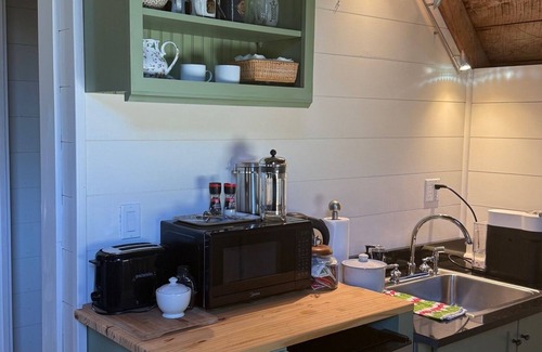 - Shed Peaks: private detached queen bedroom near the garden (no bathroom, with electricity, porch & deck, airy breezes)