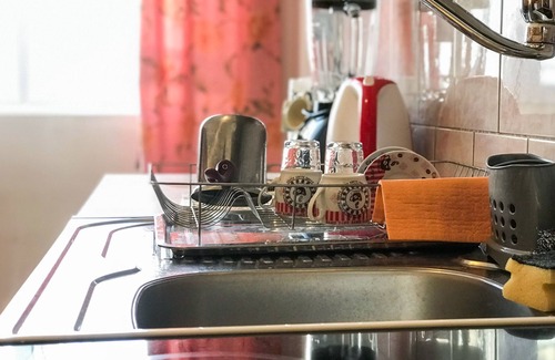 The kitchen is fully equipped with all necessary tools for making and serving food, and dining table.