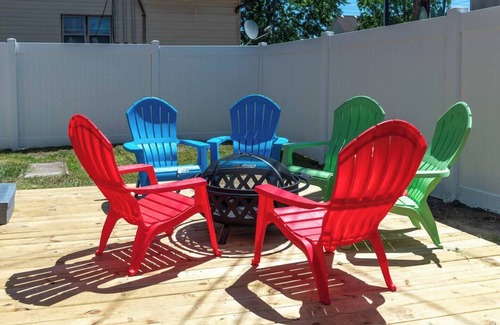 Outdoors, luxuriate in the hot tub in the secluded fenced yard and reflect on your day as you chill out on colorful Adirondack chairs around the firepit.