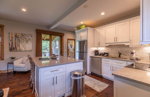 Unwind at Reel Relaxing, a beautiful 1 bedroom cottage in the exclusive River Club of Eagles Nest! This warm and welcoming home features an open concept floor plan with an updated modern kitchen with granite counters and stainless steel appliances, a dining table for 4, a sitting area arranged around a gas log fireplace with a TV mounted above, and a full bathroom with a shower. The entire upper level of the home is the luxurious bedroom suite with a King bed, a sitting area with another TV, two twin beds arranged toe-to-toe in a window alcove, and another full bathroom with a shower. The home has a private hot tub for your use, as well!