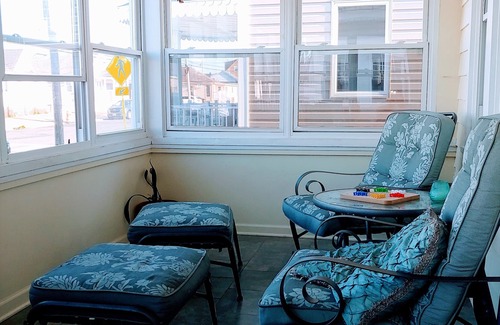 The enclosed front porch is a dream! Relax on summer evenings and enjoy a casual meal, the cool ocean breezes and the energy of passers by as vacationers head to and from the boardwalk. Or pull up a chair and enjoy a game of checkers or cards. There's plenty of seating available on this airy porch.