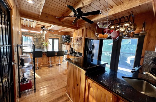 The main floor has a full kitchen that is fully stocked with any cooking items you may need including pots, pans, baking pans, crock pots, serving dishes, etc... There is also a large walk in pantry to tuck away all your vacation groceries. The enormous granite table is a centerpiece in the room and seats 8 people comfortably for dinners, games, or just hanging out. There is also a living room area, a large flat screen tv, a convenient 1/2 bath, a coffee bar, a large bedroom with 2 queen beds and a large en-suite bathroom which is perfect for lots of kiddos or 2 couples to stay comfortably. There is also a washer and dryer on this floor for your use.