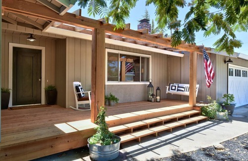 Our home, so close to all the attractions, is uniquely charming, tastefully decorated, and offers you a genuine Sonoma living experience. Our recently remodeled home welcomes you to live like a local, but play like a tourist. Each room boasts a unique, one-of-a-kind rolling barn closet door - pick your favorite. We recently installed a cute, hexagonal hot tub, nestled amongst the flowers. Turn on the jets, gaze up at the stars and think how lucky you are that your friend picked “Sonoma” for their wedding... Adjacent to the hot tub is a comfy seating area under a beautiful redwood arbor, complete with a hanging bed. Lie down, relax and fade away to sleep. For dinner, wander into the raised vegetable beds complete with tomatoes, squash, cucumber, pumpkin and even strawberries (if the last guests left any) and pick what you need. They’re all for guests. Feel free to grill them on the BBQ, just off the garage. We have 9 Full Grown Laying Hens out back your kids will surely love to feed and pet. Each one lays a different color egg! If you like fresh organic free-range chicken eggs some will be awaiting you upon arrival. At night, lite a fire in the fire pit and roast some s’mores while toasting your friends and enjoying champagne. Or settle down in a comfy couch and watch a new release on the projector with its on automatic movie screen in the garage. We hope you’ll have the time of your lives during your stay in Sonoma wine country. We just aim to be your HQ while you go off to explore!