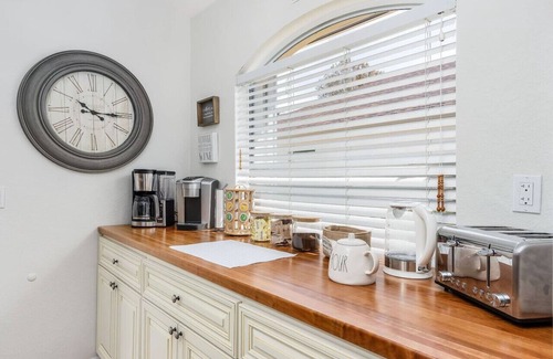The dining area is perfect for indoor entertaining - it seats 6 but there is space for more people if needed. leading through to the fully equipped kitchen, including a breakfast bar and a coffee station, where coffee lovers will find everything you'll need. There is a choice of a Keurig or regular coffee machine, a french press and even a coffee bean grinder, as well as starter amounts of Keurig pods, ground coffee, sugar and sweetener. For tea lovers, there is a kettle, a tea pot and a selection of teas for you.