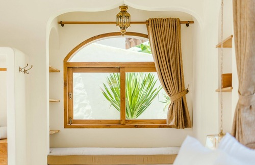 The bedroom is designed to feel good with a comfortable bed, desk and wardrobe. The en-suite bathroom is open and offers a spacious bathtub to enjoy a bubble bath under the stars or in the sun! The large glass doors offer the most beautiful view to wake up in the morning, overlooking the private pool area and garden. You can be sure to have easy mornings here!