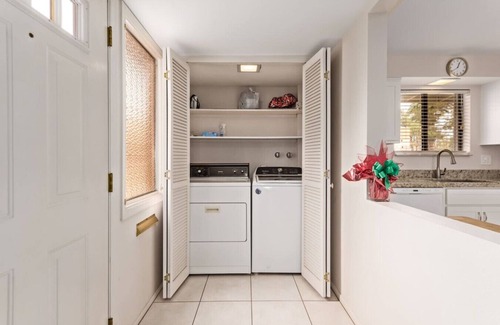 Kick back in this cozy 2-bedroom + den haven overlooking the golf course! Perfect for up to 6 guests, enjoy 4 comfy beds (including a sofa bed), 2 bathrooms, and everything you need for a great stay—cable TV, fast Wi-Fi, a charcoal grill, and even a meat grinder! Whip up meals with a waffle maker, blender, and more. Unwind with puzzles, playing cards, or work from the den's dedicated office space with a printer. Washer/dryer in-unit for convenience. Your relaxing escape awaits!