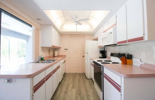 The guest bedroom features two twin beds and a convenient attached bathroom with a soaking tub and shower combination, offering comfort and privacy for all. The fully equipped kitchen is a chef's delight, with modern appliances, ample counter space, and accordion-style lanai doors that open seamlessly to the patio. Whether you're preparing a family meal or enjoying a quiet breakfast, the kitchen's connection to the outdoor space ensures you're always in the heart of your vacation experience.