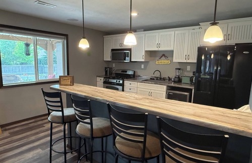 Get ready to relax in this 4-bedroom house in Sioux Falls. This peaceful retreat offers 2 king beds, 2 twin beds, and 2 full beds, 2 full kitchens (plenty of space for eating) perfect for a group getaway. With amenities like WiFi, a hair dryer, and a washing machine, your stay will be pleasant and stress-free. The 3 bathrooms come equipped with a shower, bathtub, and more. Outside covered patio for relaxing, enjoying the warm fireplace with outside patio furniture & grilling with family or friends. Experience the magic of Sioux Falls at our excellent house.