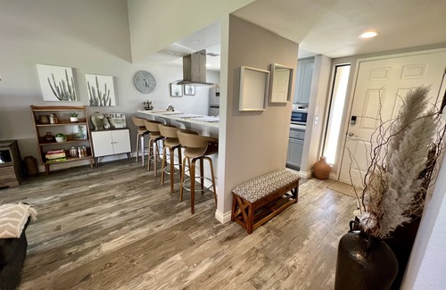 This 2 bedroom, 2 bathroom condo also includes new flooring and furniture throughout, vaulted ceilings, and an updated fully-equipped kitchen and new stainless steel appliances. Wake up with a cup of coffee and a breathtaking view from the primary bedroom which includes a king size bed, flatscreen TV and private bathroom. The quaint, cozy guest bedroom includes queen size bed and flatscreen TV. Feels like a boutique luxury hotel with the comforts of home. There is also a washer and dryer for your extended stay.