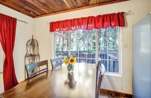 Escape to our cozy cabin nestled among majestic redwoods. Enjoy the large covered porch, a yard with a lawn, an elevated patio with flowers, a deck with a picnic table, and a private hot tub. Inside, find a full kitchen, dining area, living room with couches and TV, two queen bedrooms, and a bathroom with shower/tub. Close to Occidental's restaurants, bars, and shops. Just six miles from the Russian River and in the heart of Sonoma County’s wine region. Perfect for a relaxing getaway.