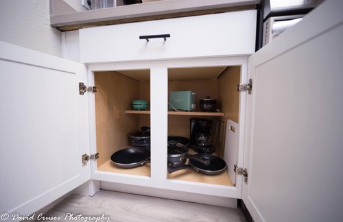 * Kitchen with refrigerator, oven, microwave, pots/pans, dishes, cups, utensils