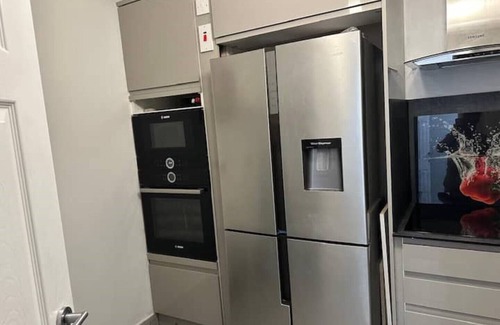 The kitchen has a fridge, a hob, an oven, a toaster, a kettle, a freezer and a microwave.
