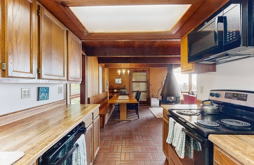 A cone fireplace reminiscent of the 1970s and a rack of wood punctuate the living room, inviting guests to curl up with a blanket by the fire. A wrap-around deck just off the living room offers patio chairs, making it the perfect spot for taking in the fresh sea air. When you aren't taking in the views, watch satellite TV, or pop in a DVD or VHS movie at the media center. Just off the living room is a small den with built-in bookshelves and a CD and cassette player.