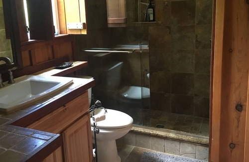 The downstairs has an open concept kitchen with granite countertops and living room. The downstairs bedroom features a queen bed with patchwork quilt and exquisitely tiled bathroom with shower. Upstairs bedroom includes a king bed with small desk and sitting area along with a private bathroom. The living room sleeper couch can be used to accommodate 6 guests with limited privacy and sharing the downstairs bathroom.