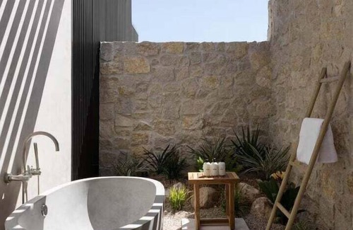 Step outside to a serene covered patio with built-in grill and outdoor dining, then make your way to the refreshing resort-style pool & hot tub with panoramic desert views. For those looking to unwind in nature, the primary bathroom opens to a private garden with an oversized soaking tub and outdoor shower surrounded by stone walls.