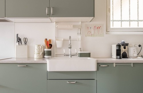 Elegant in its subtle viridian hues, the serene modern kitchen is equipped with all key amenities needed during your stay including an oven, hobs, a microwave and a dishwasher. Planning to explore Paris across a weekend? Keen gourmands may be tempted to join the throng of locals that congregate at nearby Marché des Batignolles on Saturday mornings, a farmers’ market rich in seasonal organic produce.