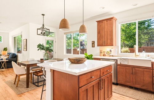 - Gourmet Kitchen: Our fully stocked kitchen is a dream for those who enjoy cooking at home. With high-end kitchenware and ample counter space with beautiful design aesthetic, it’s ideal for everything from a quick breakfast to a gourmet dinner. Social cooking is a breeze in the open-layout space!